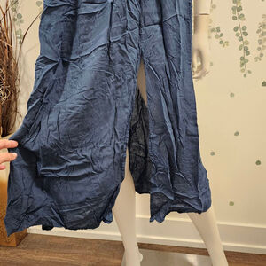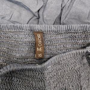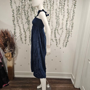 This is a new, Boho Me brand, size XS dress. The navy blue rayon dress features a smocked bodice, ruffles on the shoulders, and a midi-length skirt with a slight A-line shape. It is made of 100% rayon. The dress shows no visible imperfections. The item is in new condition, but lacks original packaging and tags.