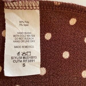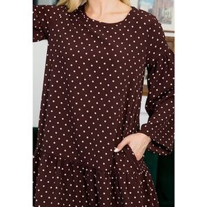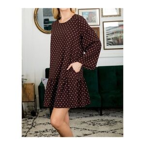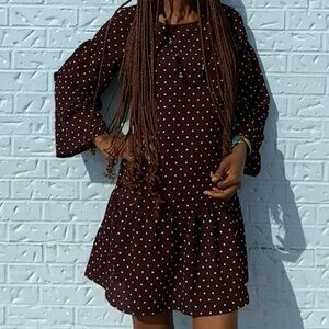 NWOT Women's Brown White Polkadots Long Flare Sleeves Mini dress with Pockets
