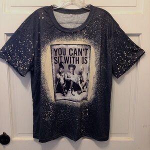Get into the Halloween spirit with this women's plus size dark gray bleached short sleeve t-shirt, featuring a spooky, funny witch trio graphic print “You Can’t Sit With Us”. The crew neck and pullover closure make it easy to wear, and the lightweight, stretchy, and breathable material of polyester and spandex ensure comfort for all occasions.