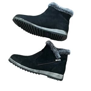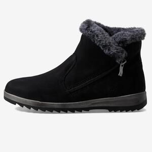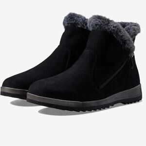 A cozy faux-fur lining and collar bring ultimate warmth to a nubuck bootie designed with a foam-cushioned removable insole and grippy sawtooth tread.