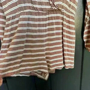 It is a cute jumper/romper in a size medium (probably fit a size small) better. This jumper is nice and lightweight in a muted red and white striped pattern, with elastic on the cuffs and around the waistline. This jumper still has the hangtag on it. It is 100% rayon and the measurements are 18.5" PTP, sleeves are 23", there is an elastic around the waist the measurement from shoulder to waist is 17" and the waistline to the crotch is 12" It has a snap on the front of chest. The length from the shoulder to the hem of the shorts is 28" on the front and 29" on the back and the inseam is 2”. If you need any more measurements please don't hesitate to ask.