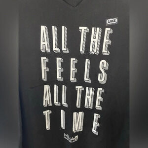 Rock this graphic tee from Mental Health America that recognizes that it’s okay to have “All the Feels All the Time”! White on black print. V-neck. Women’s fit. Short sleeve. 100% cotton. Machine washable. Tear away label. Brand new without tags (size large sticker is on the front still).