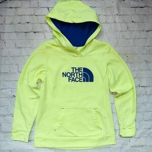 New Without Tags Women’s Medium The North Face Pull Over Hooded Sweatshirt Hoodie. Fluorescent Yellow With Blue Hood Lining. Kangaroo Pouch Pocket In Front. 100% Polyester. Note Last Pic Of Sleeve. Very Faint Marking on One Sleeve (From Try Ons). Have Not Attempted to Treat. Smoke Free Home. #northface #hoodie #sweatshirt