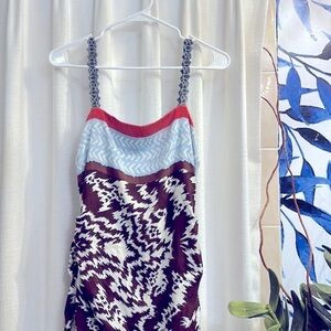 92% silk, 8% spandex with polyester lining. Blue straps with beading, Red stripe along the back that is also along the top and bottom of the dress. The top and bottom are also rimmed with a blue and off white pattern. It is brown and off white in the center.