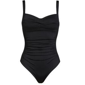 Attract attention in this shapely one-piece designed with a twisted sweetheart neck and flattering front ruching.