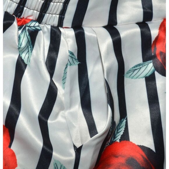 This elegant Afibi maxi skirt features a striking combination of stripes and a red floral design. The pull-on style with an elastic waist ensures comfort, and it includes pockets for added convenience. Perfect for casual outings, this skirt is both stylish and functional.