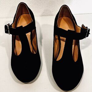 NEW WITHOUT BOX ~ Women's US Size 8W (8 Wide Width) / EUR Size 39 ~ Black Faux Suede T-Strap Mary Jane Heels ~ Adjustable Buckle Strap ~ 2.5 Inch Heel Height ~ Only Worn Once While Inside for a Short Time ~ Unbranded