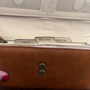 NWOT Women’s Tan Long Wallet by Guang Tong. This stylish and functional wallet features a tri-fold design with a dark tan exterior and light tan interior. It offers ample organization with: