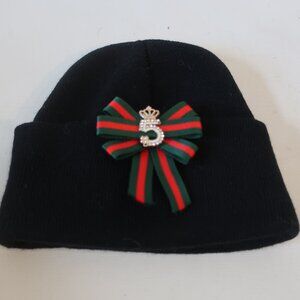 NWOT Womens Tina Demel Black Knit Beanie Hat W/Green & Red "5" Bow Tie OS