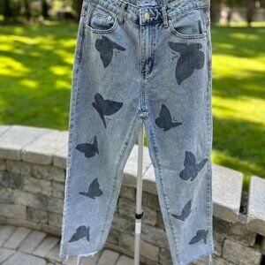 Adika, Butterfly Print, High-Waist Jeans, Mom Jeans, Y2K Style, Light Wash Denim, Streetwear, NWOT, Trendy Pants, Festival Fashion, Relaxed Fit, Vintage-Inspired
