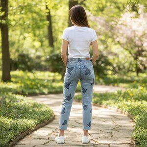 Add a playful twist to your denim collection with these Adika high-waist mom jeans featuring an allover butterfly print on a light wash. These NWOT jeans blend Y2K-inspired style with a relaxed vintage fit that flatters your waist and hips. Perfect for pairing with crop tops, sneakers, or boots for a street-style vibe.