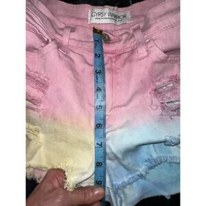 BRAND NEW WITHOUT TAGS FROM GYPSY WARRIOR - DENIM DESTRUCTED DAISY DUKE SHORTS IN A PASTEL TIE DYE MIX OF BLUE, PINK AND YELLOW. A LITTLE STRETCHY (2% ELASTANE, 98% COTTON). SIZE S, MEASUREMENTS IN PHOTOS.