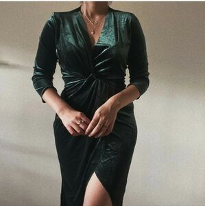 NWOT ZARA Green Velvet Low V Neck Midi Knot Front Pencil Dress size M 8 10