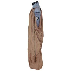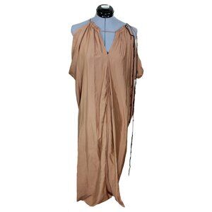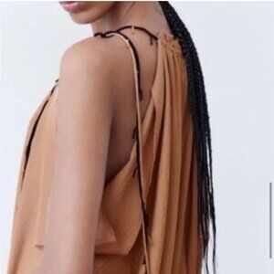 ZARA light brown maxi length sleeveless kaftan with long, beaded tassel detail on left shoulder. Oversized, relaxed fit and lightweight. Slight distressing around hems for boho effect. Slit for mobility.