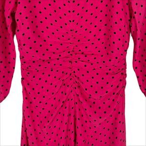 New without tags. Zara Asymmetrical Hem Bright Pink Polka Dot Dress. Bright pink with black polka dots. V-neck. Ruching at stomach. Zips in back. Polyester. Size XS.