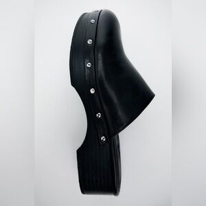 NWOT. Zara Black Studded Clogs. Round Toe. Sole Height: 6 cm. TOP - 100% POLYURETHANE. LINING - 86% POLYESTER, 14% ELASTANE. SOLE - 100% RUBBER. INSOLE -