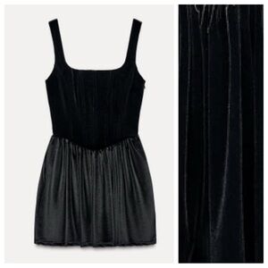 NWOT. Zara Black Velvet Corset Short Dress with Square Neckline and straps. Side pockets on the seams, pleats at the waist. Concealed zip fastening at the side. Size XS. Ref. 4764/287. Pit to pit 17,5" flat, waist 13,5", length 30". 1037.