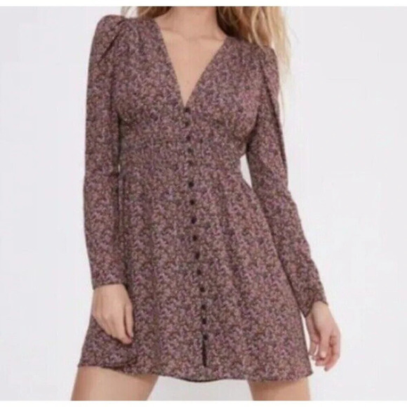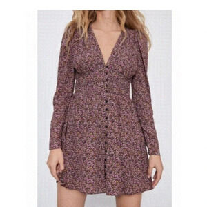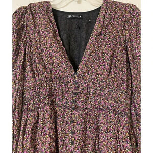 Add a touch of whimsy to your wardrobe with this beautiful Zara mini dress. Featuring a vibrant floral pattern and a flattering V-neckline, this dress is perfect for any bohemian or fairy-inspired occasion. The long sleeves and smocked waist make it a comfortable and stylish choice for any woman, while the lined viscose material ensures a soft and comfortable feel. This dress is available in size M and is perfect for any woman who loves flowers and wants to add a touch of elegance to her wardrobe.