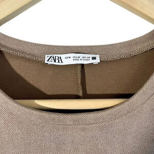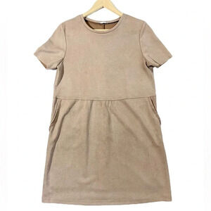 Round neck dress with short sleeves and faux leather trimmed pockets.