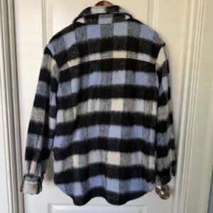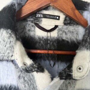 Zara Man black and blue checked relaxed fit overshirt in size L. This collared fluffy checkered button-down features a soft texture and a stylish pattern, making it a versatile layer. Excellent, new without tags condition. Perfect for a casual, stylish look.