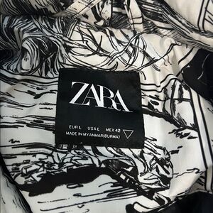 Chic Zara Button Up jacket with striking black and white graphics. Ideal for a modern look.