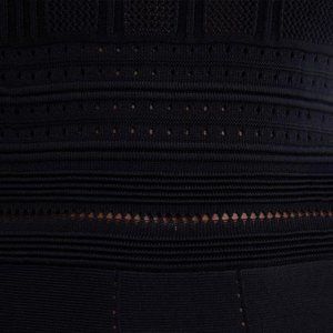 Long sleeved openwork knit dress. Round neck, a line skirt.