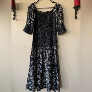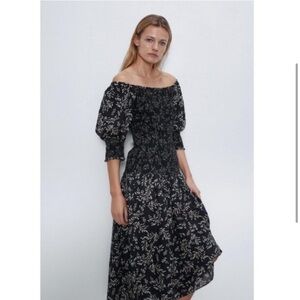 NWOT Zara Penny Ruched Black Floral Linen Blend Boho Midi Dress Size Small