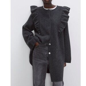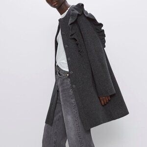 NWOT Zara Ruffled Shoulder Snap Front Cosy Knit Sweater Coat Grey Small
