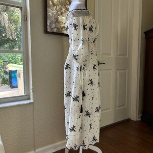 Pretty white cotton maxi dress that can be worn on or off shoulder. Black floral embroidery with tassel drawstring at waist and sleeves with elastic neckline. Fully lined. Made in India. Roomy dress. Measurements: length, 46"; armpit to armpit, 18.5"; waist, 19.5"; hips, 25".