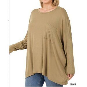 NWOT Zenana Khaki Long Sleeve Luxe Rayon Front Pocket Top
