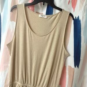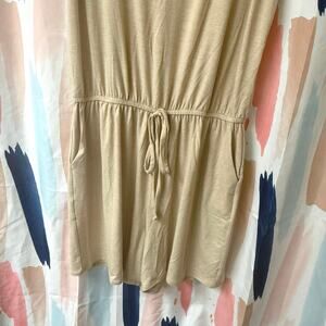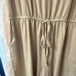 • Other information: Simple beige relaxed fit pullover romper featuring a scoop neckline, sleeveless design, elastic waistband with drawstring, and two side slant pockets.