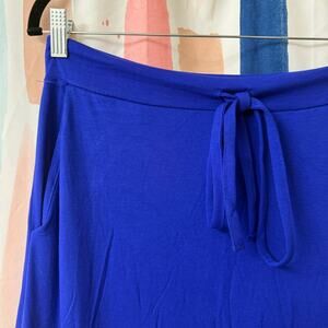 • Other information: Simple blue pull-on maxi skirt featuring drawstring tie waist, high waistband, side pockets, ankle length, and relaxed fit.