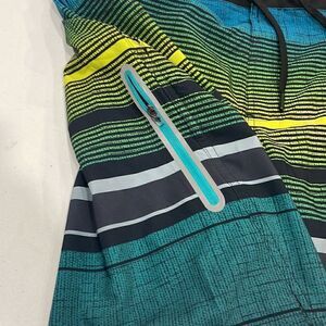 ⭐ ZeroXposur swim trunks bathing suit shorts striped teal black yellow aqua blue tie velcro closure lined pockets zipper lightweight soft spring summer beach vacation ocean cruise pool party cook out sun bathe tan river lake floating boating skiing surfing size M medium NWOT new without tag 9oz Bin 29