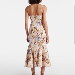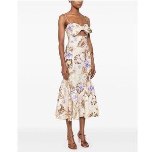 Elegant cream dress with purple floral patterns, perfect for any occasion.