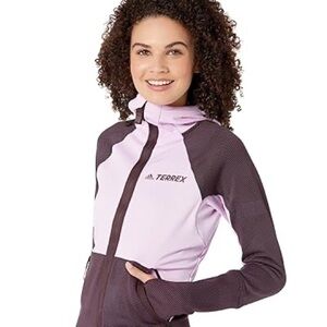 This adidas ski jacket features a striking color blocking design in purple shades, combining a light lavender upper with a deeper plum lower. It includes a full-zip front and a high collar for added warmth, while the fitted silhouette ensures a sleek look. Long sleeves with thumb holes enhance functionality for outdoor activities.