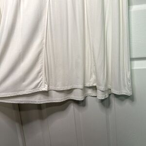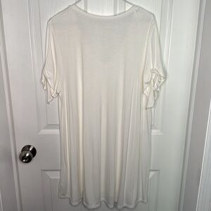 NWOT a.n.a. Short Sleeve Tunic Top, women’s size XLT. Top features ties at the bottom of the sleeves. Color is white. Fabric is 95% rayon and 5% spandex. Very soft and stretchy fabric.