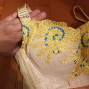 Cream colored push up bustier bra w beautiful teal and yellow swirly crochet details on + between the cups, bra features removable straps so you can have them traditional or across your back etc, & removable padding, as well as 4 eyelet closures per row, providing support and comfort. Very creative look, and very unique, great fancy or festival attire.