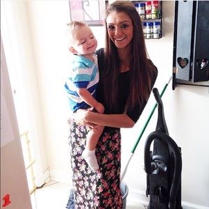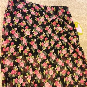 Black floral skirt. XS can fit a small. This is a boutique skirt. It has a short black skirt under it so the leg area is sheer. Brand new never worn, just tried on and my baby boy wanted to get in the picture lol