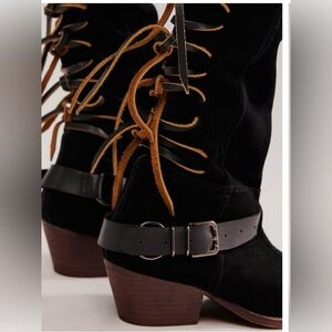 Features: Tall style, slouchy design, suede uppers, pull-on, pointed toe, lace-up back detailing, spur strap with buckle accent, block heel