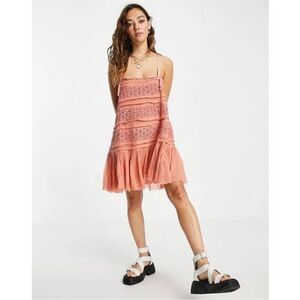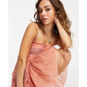 Gauze mesh silhouette with crochet lace paneling and a gauzy ruffled skirt. Adjustable straps Fully lined Straight neckline FP One Old World embellishment with a modern twist.