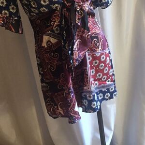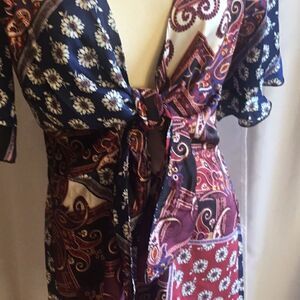 Back zipper, lightweight polyester material, front ties at bust & is open to belly below, ruffled hem sleeves