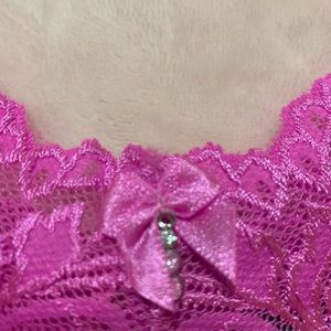 Hot pink lace underwire bra with matching lace panties. Never worn, laundered and stored. Bra is size 42D and panties are size 10.