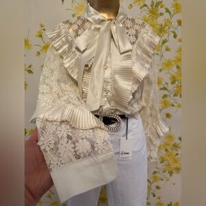 NWOT, never worn lace blouse long sleeve lace top, featuring a Gorgeous lace construction with statement ruffle on chest and sleeves, stunning silky satin wide tie neck, sweet details, button front and cuff, sexy see through lace, feminine blouse, Lolita Victorian style, prairie, Edwardian. The moon ruffled blouse. smoke pets free environment, fast shipping. Color may vary by device screen and light. Vintage style lace blouse. Size tag is L, refer to measurements for a better fit. White jeans and belt sold separately