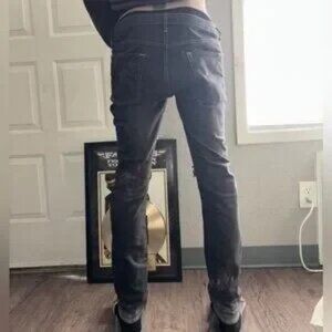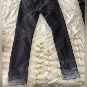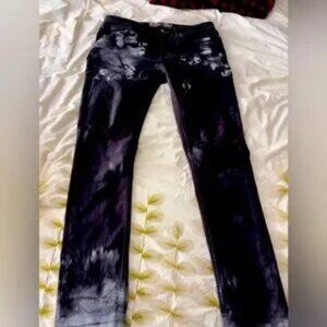 This is a rare, one-of-a-kind pair of 30/32 NWOT jeans crafted from blackish denim by a luxury English brand. The piece features an extraordinary super cool, extra special honeycombing and whiskering effect, achieved through a unique reverse bleach technique. Handmade and imported, these jeans are a true testament to exceptional craftsmanship.