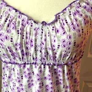 NWOT night dress. Size: medium to large Color: white with purple flowers. Armpit to armpit 15 inches. Shoulder to hem 31 inches. Never worn. Brand new.