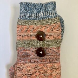 NWOT over the knee high striped cable knit socks in earth colors - heather green, orange, and blue stripes with coco shell buttons.