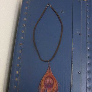 NWOT peacock feather cord necklace. The cord is kind of a suede-like material. The peacock feather is a reddish color, trending towards purple in the center. Brand new, never worn.