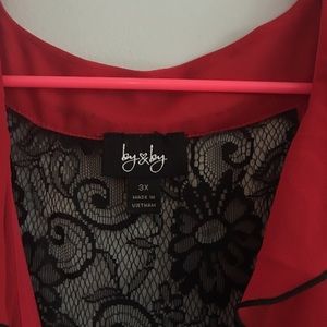 Red sleeveless blouse with black lace inset. Took of tags before trying on and it didn't fit.