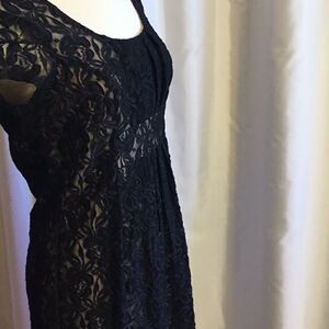 NWOT, nude lining in dress, sleeves are unlined, lining is nude color, empire type waistline, pull on style, black lace flowered overlay