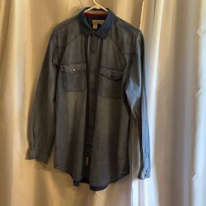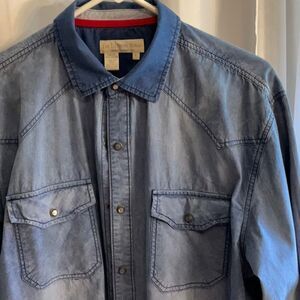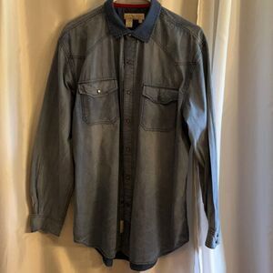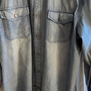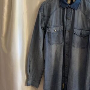 NWOT stone washed 100% cotton shirt in light blue, pearl snap closures